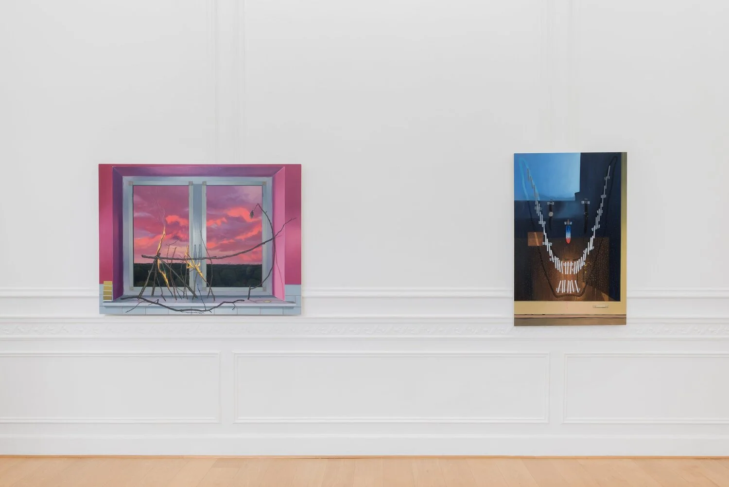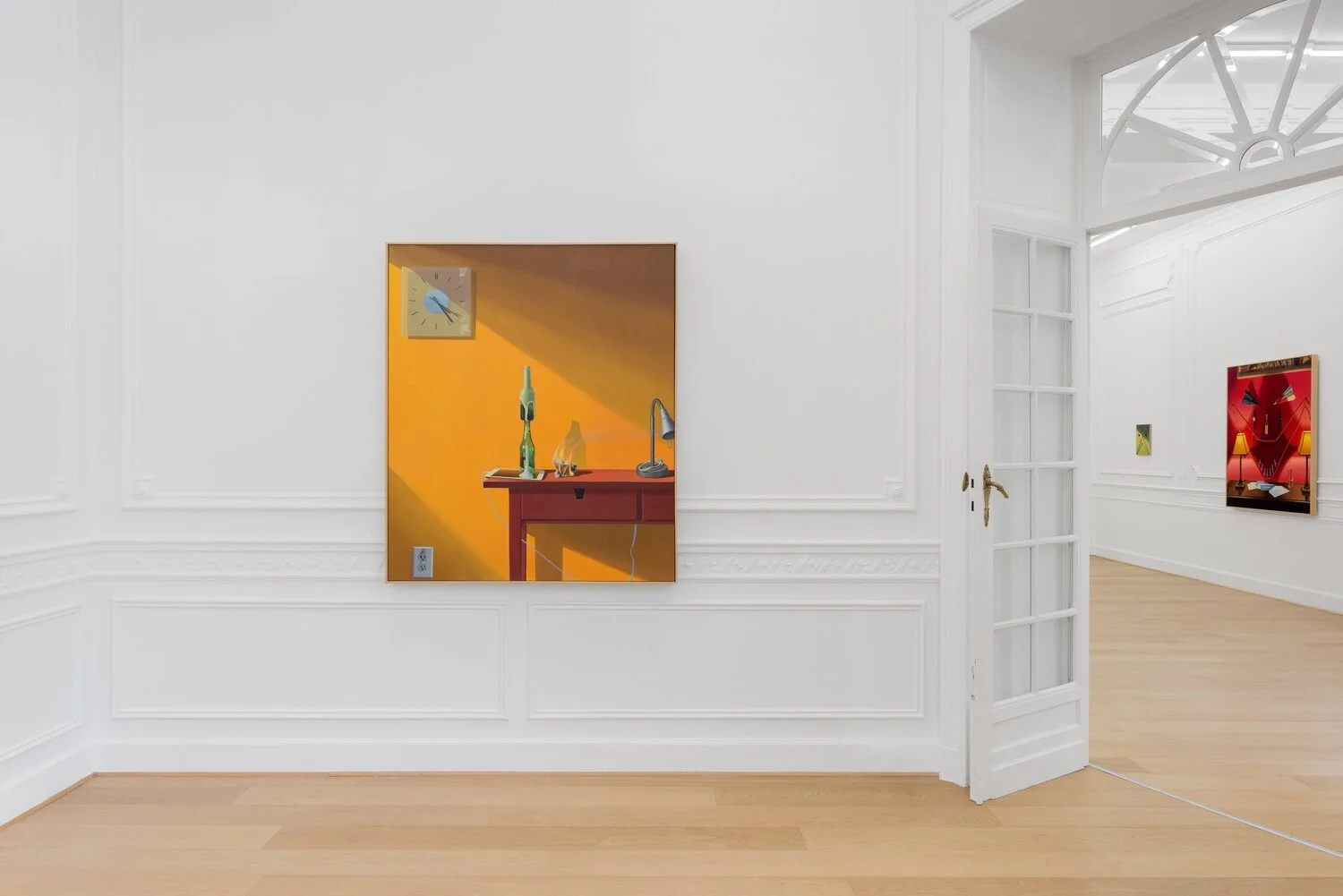 The eleven images I have made for this show are a meditation on Dewey’s proclamation. In reference to Morandi, my images are comprised of domestic objects. In some paintings, beer bottles spontaneously erupt. Kitchen clocks, power cords, wrist watches, smartphones, and various food or domestic items concoct faces, burst into flames, or sit in silence. Each painting realizes a kind of premonition of domestic life—some with equanimity, others with apprehension.